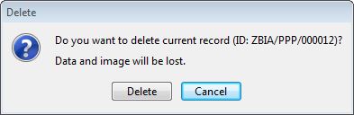 Deleting records is possible with the Records -> Delete function (or the keyboard shortcut CTRL + D). Before deleting the record, the application asks for confirmation. Both the data record and the photo file (if any is attached to the record) and the thumbnail file are deleted.
