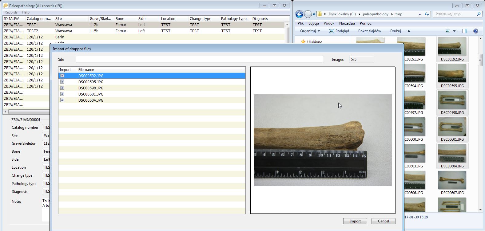 If you drag a larger number of photos, the program will display a window similar to the import photos from the folder in which the Site field can be filled out and the Import button will start importing photos into the database.