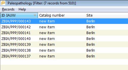 When saving a new record, the program creates the ID (ID) of the record. The identifier consists of the institution’s symbol (now: IA - Institute of Archaeology), the symbol of the researcher, and the next record number. The record number is unique within one database, in the case of deleting the last record - the number is ‘reused’, in the case of deleting records from the ‘middle’ of the database, the system leaves empty spaces in the numbering.