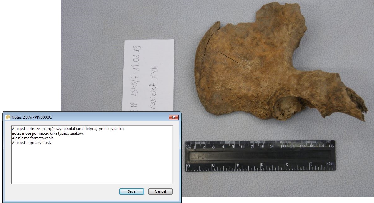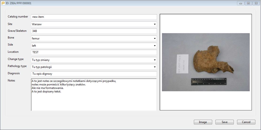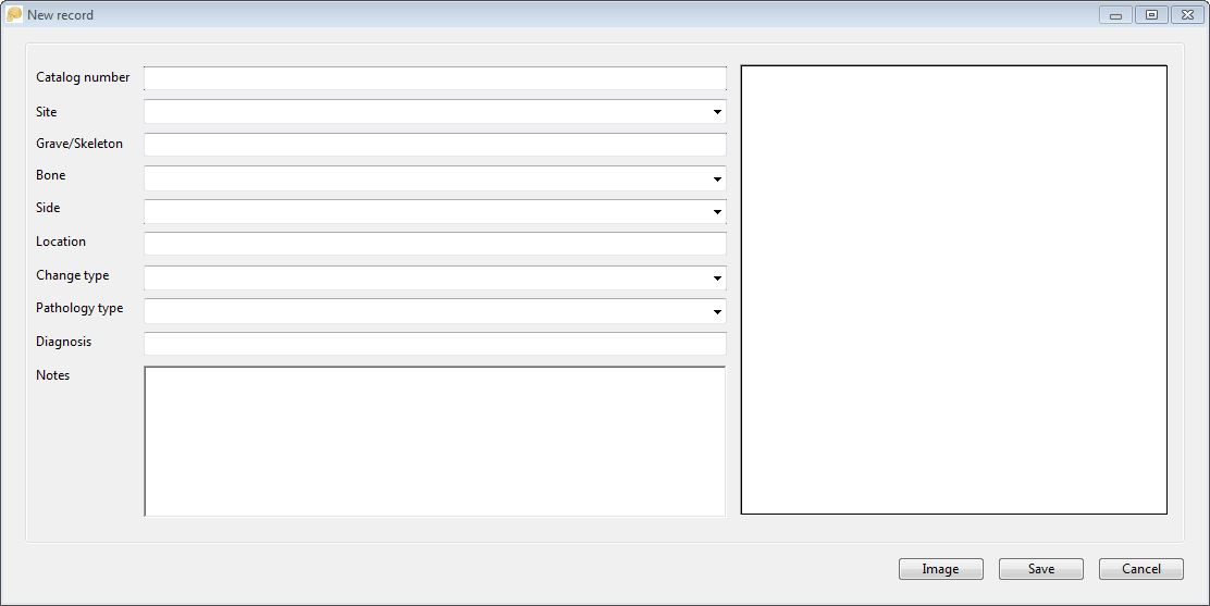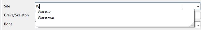 which allows for entering the data for the record. Some fields, eg Site, Bone are supported by a dictionary, which means that instead of entering values, you can choose existing one from the drop-down list. The list comprises of all of the previous entries. The ‘dictionary’ field also supports the autocomplete function, i.e. you can enter the first letter of the expected value and the program will narrow the dictionary’s content to entries beginning with the letter you enter.