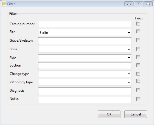 In the window, you can see all the fields of the database (except ID). It is possible to enter a fragment of the text to be found in a given field or to force the entered text to be exactly compatible with the field contents (check box must be visible on the right side of the field ). Some of the fields, e.g. Site, Bone or Change type have (just like when editing a record) the ability to choose values from a dictionary (drop-down box), in which all (non-recurring) values appear in a given field in the entire database.