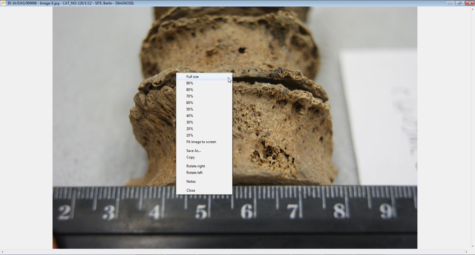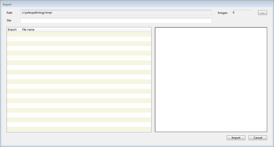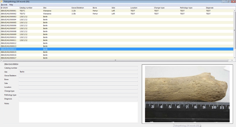 The program does not require installation. After copying the folder with the program to a local disk run the PaleopathologyGallery.exe file. You can also run the program directly from the pen-drive, but it will slow the program significantly. During the first launch, the program checks, if there is a subfolder ‘data’ and it’s subfolders: ‘image’ (for original photos) and ‘s-image’ (for thumbnail images for quick browsing) - if not, they will be automatically created. In addition, during the first launch, the paleopathology.db database will be created (in sqlite3 format).