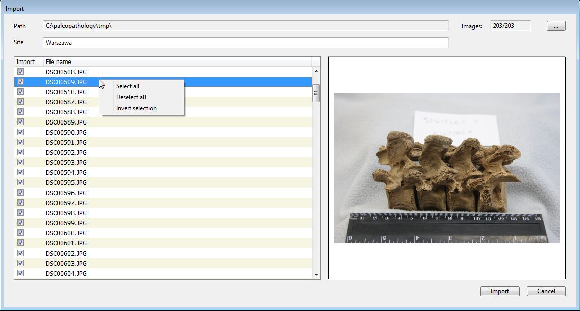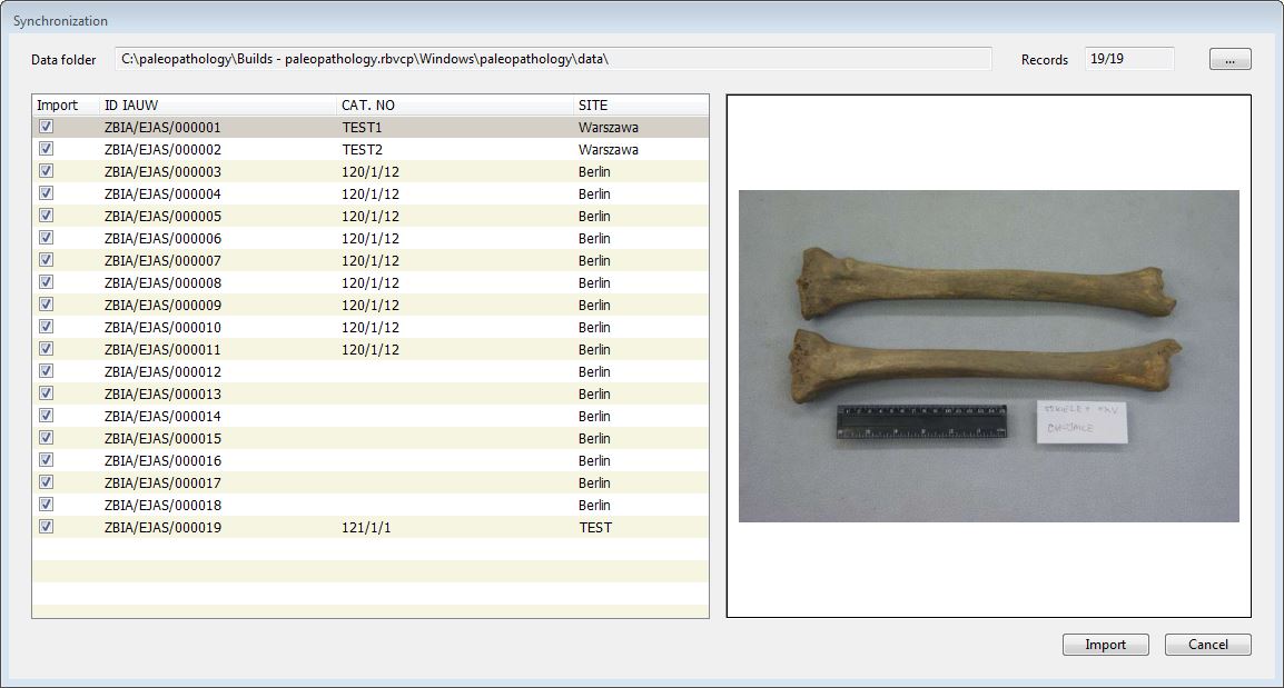 After selecting the synchronisation option, the synchronization window is displayed, in which the path to the data folder from which the data will be imported should be indicated. The folder should contain a database (paleopathology.db file), and subfolders ‘image’ and ‘s-image’. After indicating the folder, the program will display a list of records that can be imported into our database, the ID, CAT NO. and SITE fields are displayed with a preview of the current photo related to the record. As with the import of a photo folder, the functions of selecting and deselecting records are available in the pop-up menu.